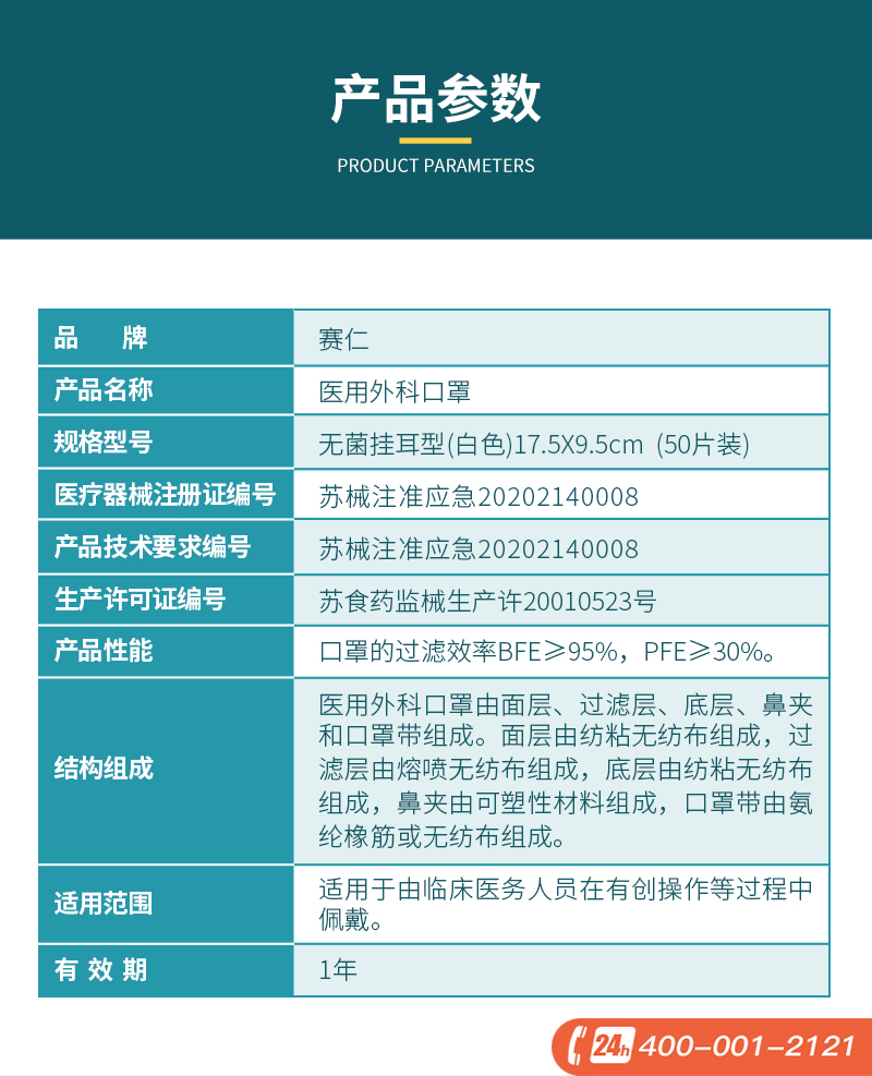 赛仁医用外科口罩(无菌白色)