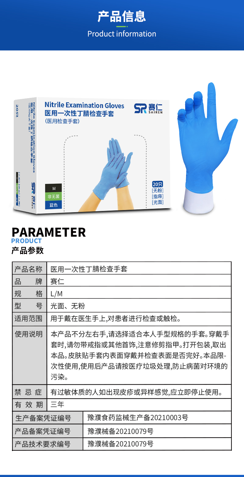 赛仁 医用一次性丁腈检查手套